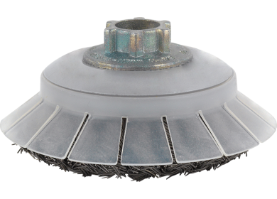 SHIELD tapered brushes offer a protective coating against dust and wire breakages due to their shape, combined with user-friendly use. The transparent protective coating also allows an unrestricted view of the workpiece. In addition, the plastic flaps offer a high level of flexibility, making it possible to machine edges and corners.SHIELD brushes are available in various designs and wire types, and offer the highest safety levels when working on steel. This tool is also frequently used to clean welding seams.